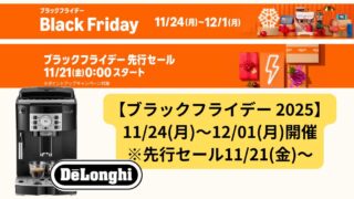 2025年Amazonブラックフライデーでデロンギをお得にゲット!先行セールは11/21開始、プライム会員なら即日配送でコーヒーライフをすぐに楽しめます。現金値引きで分かりやすく、人気モデルも対象。今すぐチェック!