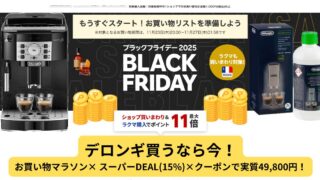 楽天ブラックフライデー2025でデロンギを最安で買う方法を徹底解説! 買いまわり最大10倍・スーパーDEAL15%還元・初日クーポンを組み合わせて、マグニフィカSが実質4万円台に。エントリー手順やポイント内訳、最もお得な購入タイミングをわかりやすく紹介します。