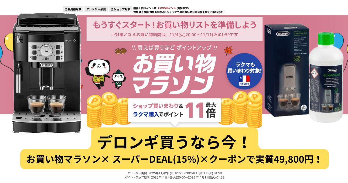 デロンギのような高価格帯アイテムは、楽天お買い物マラソン中がもっともお得に買えるタイミングです。