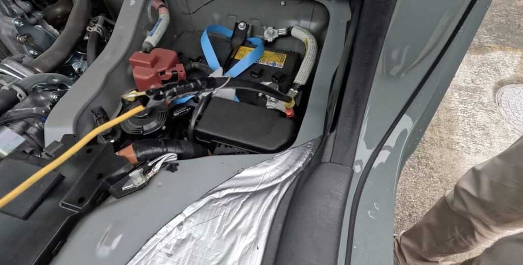 ① 助手席を上げてエンジンルームを開ける
