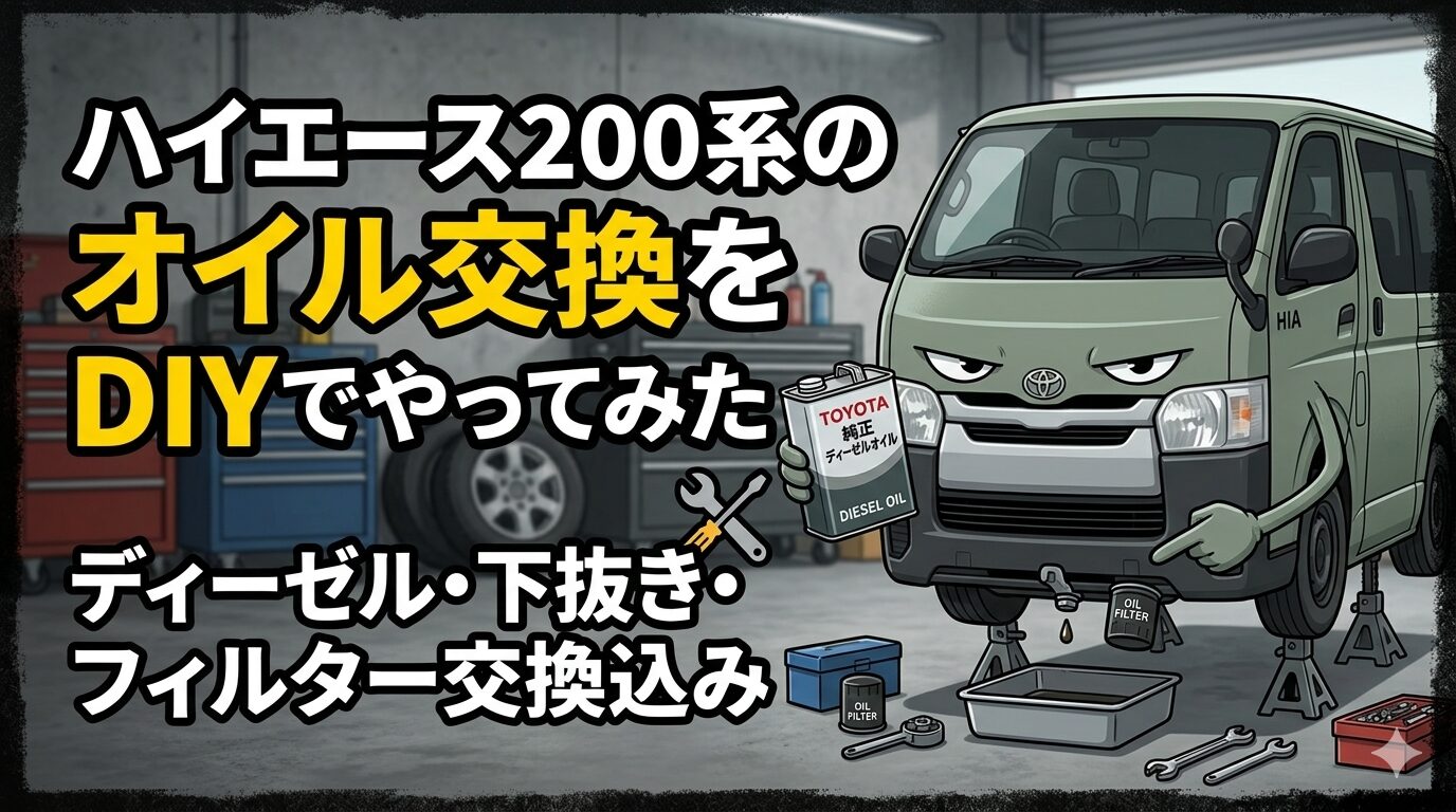 ディーゼルハイエースのオイル交換は5,000km毎または6ヶ月毎が目安です。オイルフィルター(エレメント)は2回に1回の交換で問題ありません。