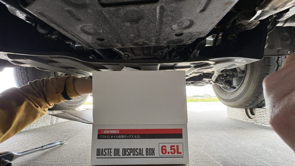 ドレンボルトの真下に廃油処理ボックスを置いてから作業します。