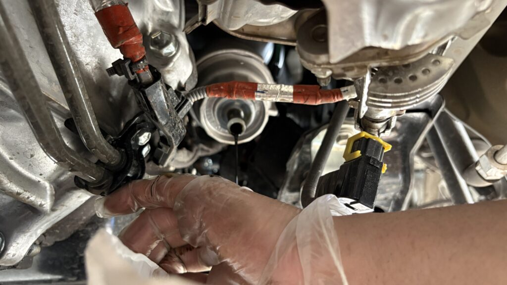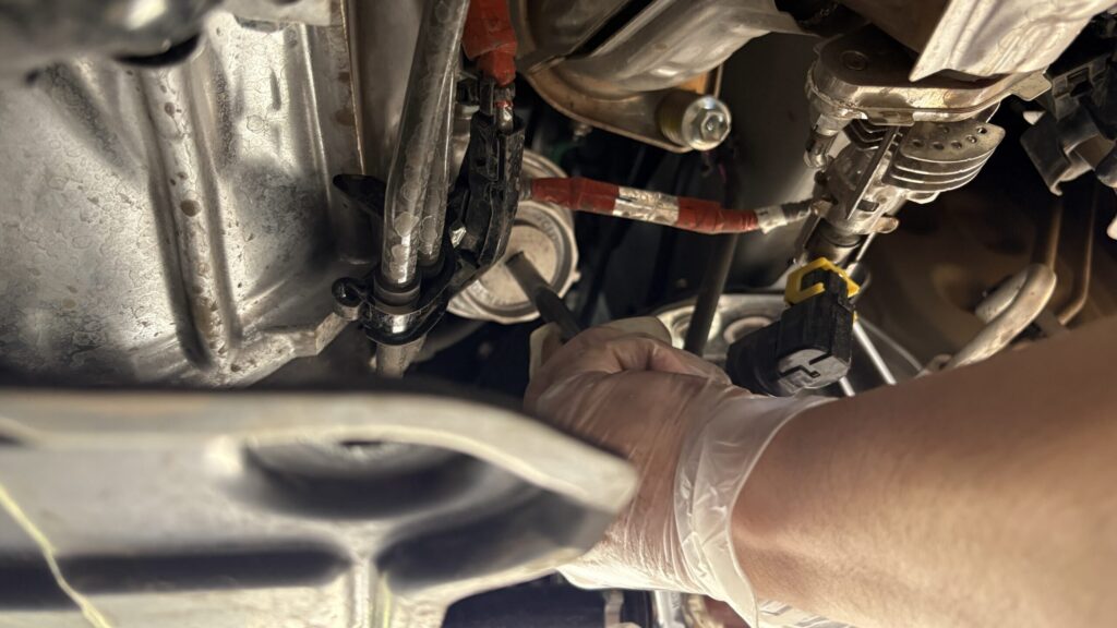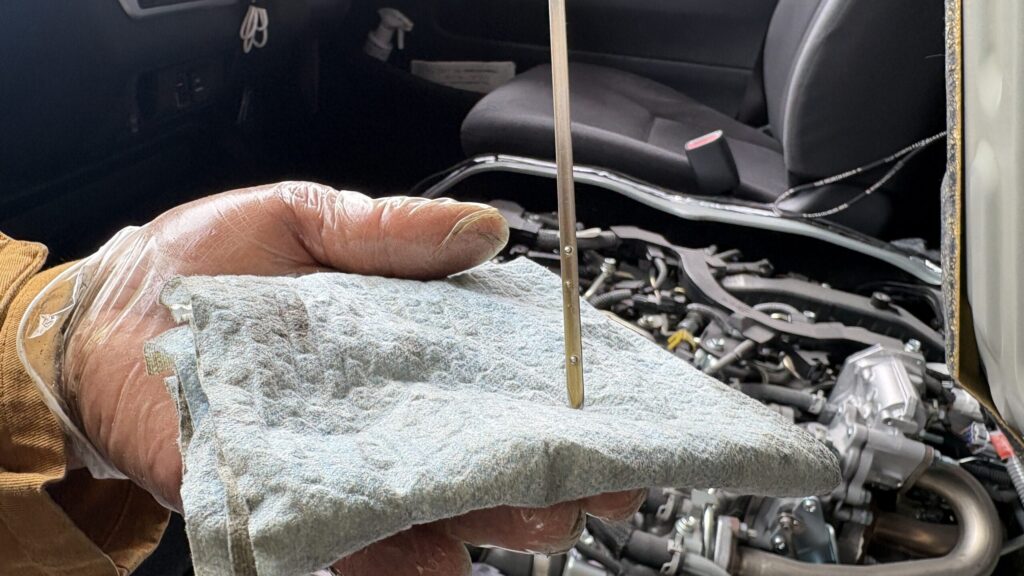 フィラーキャップを閉めてエンジンをかけ、1〜2分アイドリング。エンジンを止めて数分待ってからゲージで確認します。油面がLラインとFラインの中間〜F付近にあればOK。アンダーカバーを戻して作業完了です!