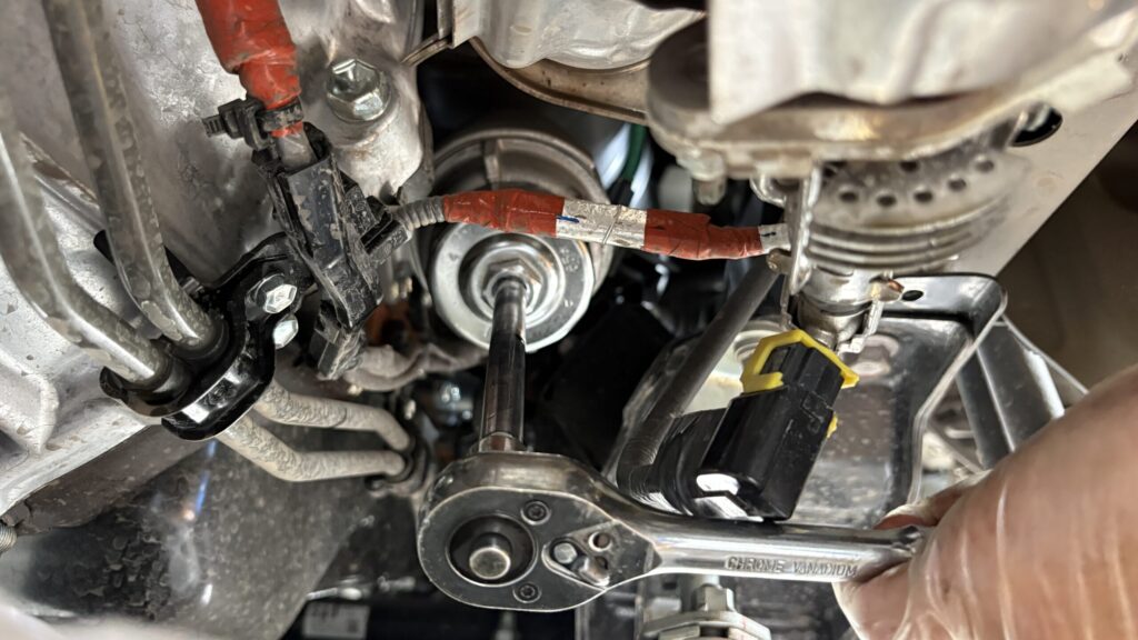 待ち時間を有効活用。12mmのラチェットで6箇所のボルトを外すだけです。