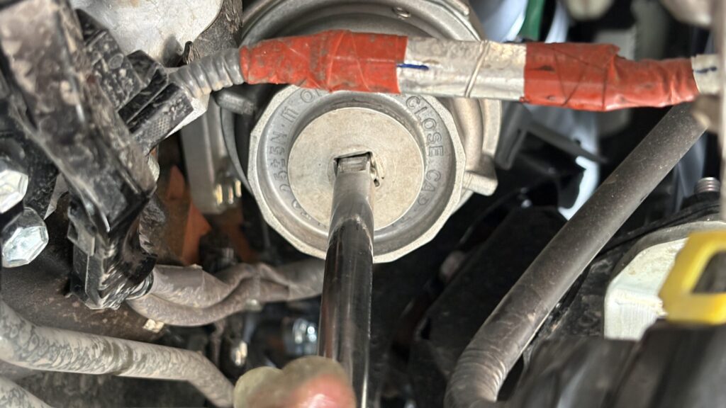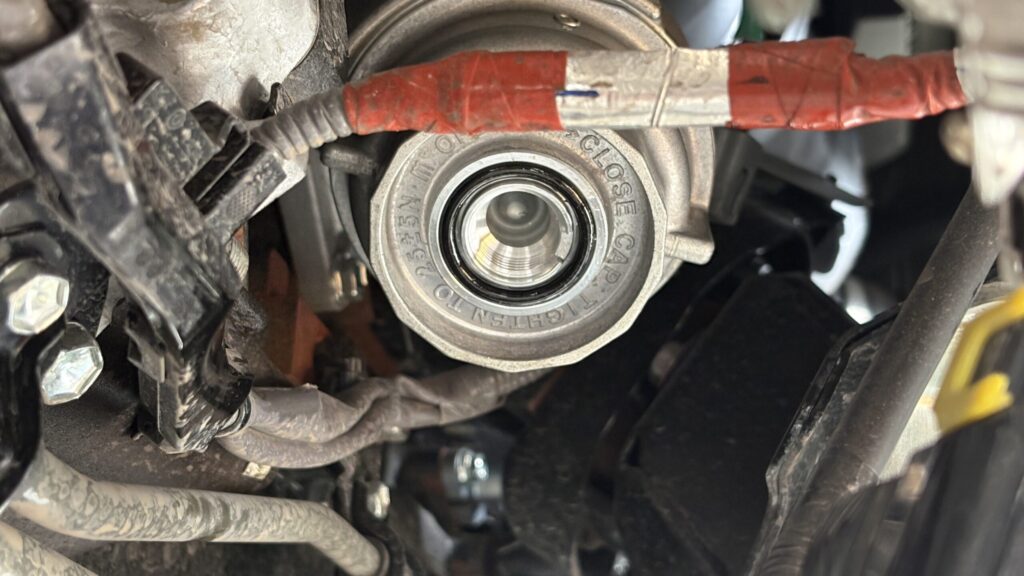助手席のすぐ下に付いているカーペットをめくり上げると、椅子を固定している金具が2か所出てくるので、そこを外すと助手席が跳ね上がります。エンジンにアクセスできたら、オイルフィラーキャップ(注油口)を事前に開けておくと、オイルが抜けやすくなります。