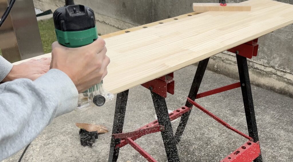 天板の全周をトリマーで面取りします。やるかやらないかで仕上がりの質感がまるで変わります。 やらなくてもテーブルとして使えますが、手触りと見た目が一段上がるので強くおすすめします。