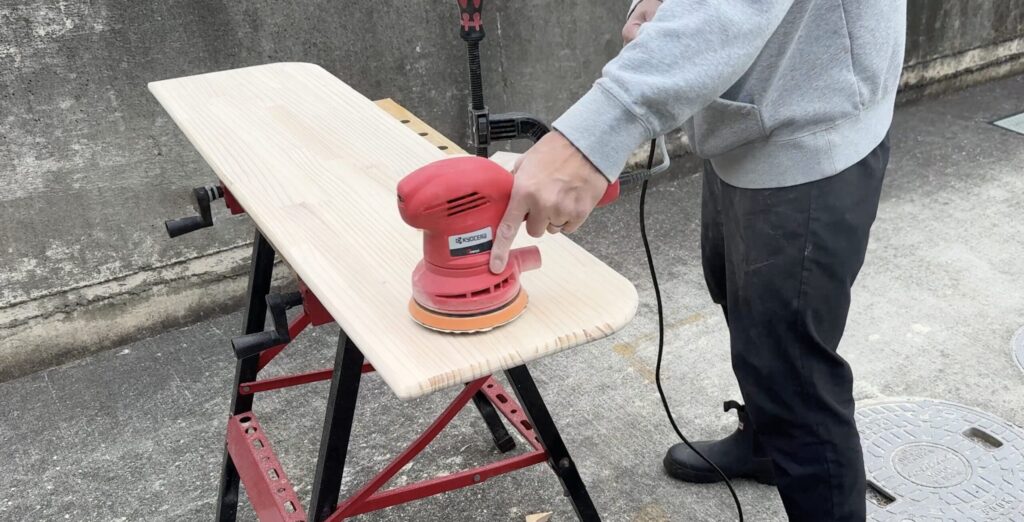 電動サンダーで全体を研磨します。粗い番手から順に仕上げておくと、次のニス塗りがきれいに乗ります。