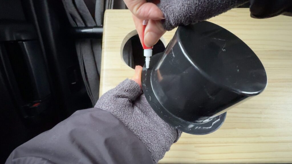 穴をあけた箇所にドリンクホルダーを瞬間接着剤で固定します。しっかり押さえて接着剤が完全に乾くまで待ちましょう。