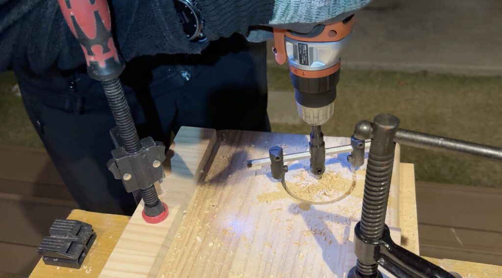 ニスを塗る前に穴をあけておきます。工具は自在ホールカッターを電動ドリルに取り付けて使用。