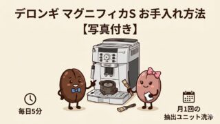 お手入れ デロンギ マグニフィカS お手入れ方法|毎日5分+月1回の抽出ユニット洗浄【写真付き】 デロンギ マグニフィカSの毎日のお手入れ手順を写真付きで解説。カス捨て・水滴カップ洗浄・水タンク洗浄の3つで約5分で完了。月1回の抽出ユニット洗浄方法も合わせて紹介します。 2025.02.16 お手入れデロンギマグニフィカS